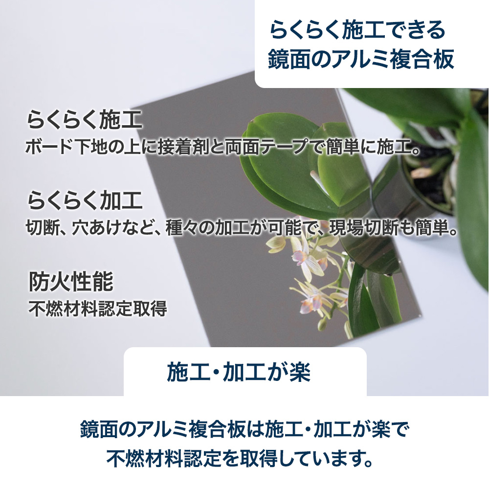 鏡面のアルミ複合板は施工・加工が楽で不燃材料認定を取得しています。