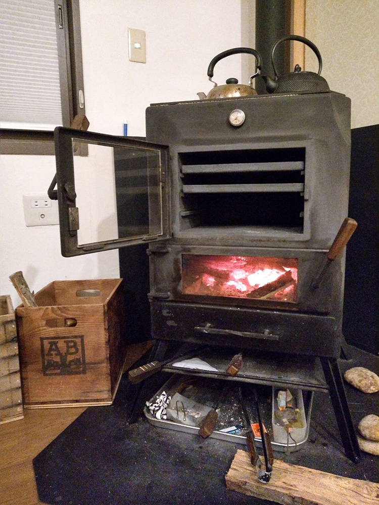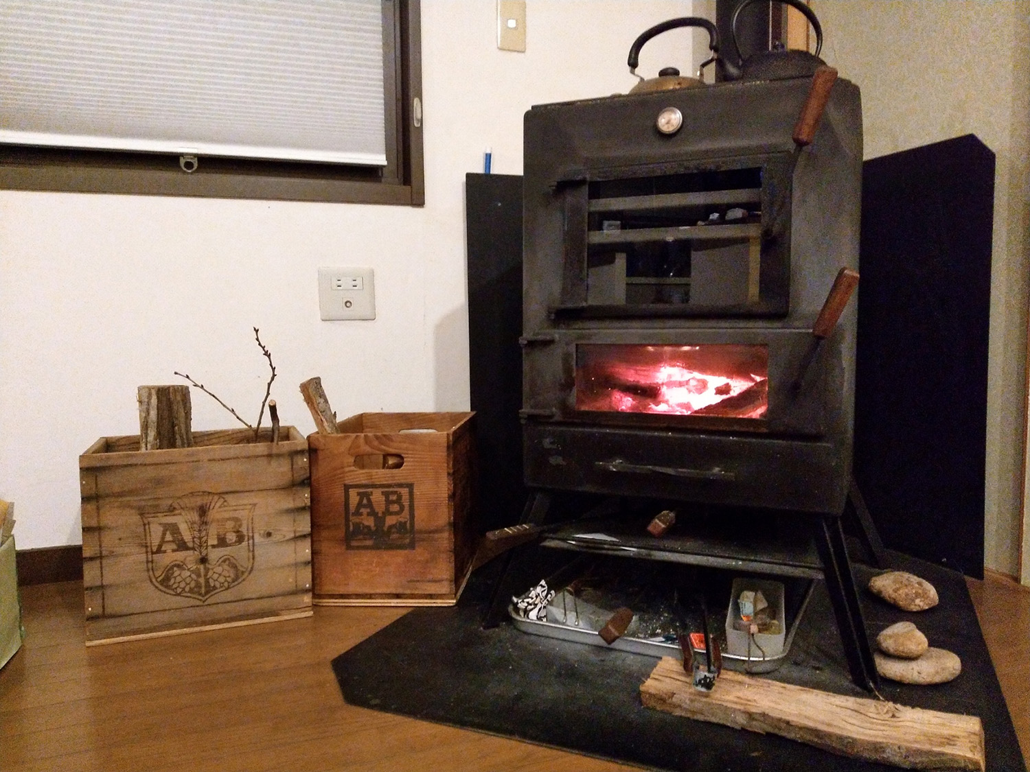 薪入れにしている古いアサヒビールの木箱の方が目立っちゃうかも・・です。ストーブの上側のオーブン扉のガラス止金具が緩んでいて落ちて割れてしまったので代品を製造元(軽井沢のハンドメイド工房)に聞いてコダマさんにお願いしました。オーブンも日常的に使っているので久々に透明クリーンなガラスになり気持ちが良いです。